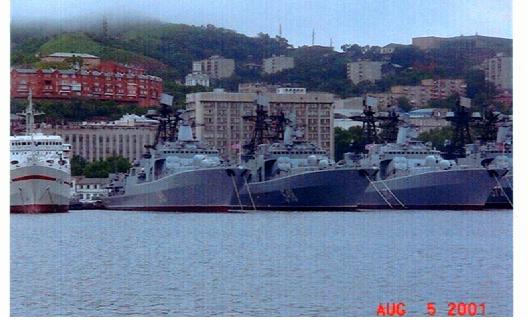 | 沿海州で水産加工食品の開発、プロジェクトを立ち上げる。関西方面の中小企業の各種貿易の代行を行う。 (写真はミサイル巡洋艦も停泊するウラジオストーク中心部の風景) |